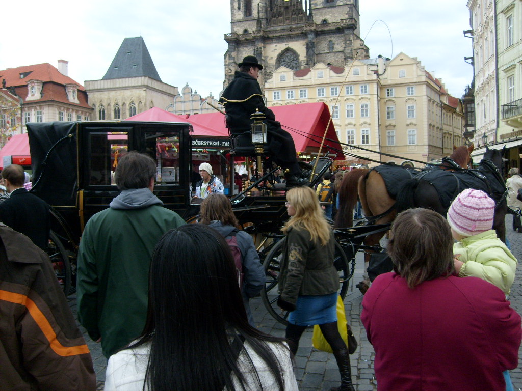 А на площади перед ратушей раскинулось море палаток и торговых рядов, как у нас на масленице, где-нибудь в глубинке. За торговыми рядами организовали стоянку несколько конных экипажей, а если немного отойти за угол, то можно было найти и раритетные машины. Туристы, паслись по площади, поедая трдло, кобласки, вепрево мясо и запивая это все пивом из одноразовых стаканов. А пива было всего один сорт Гамбринус - видать, кто проставился, тот и рулил на площади. На площади была устроена сцена, на которой вступали различные музыканты, за пару часов я услышал и классику, и джаз, и фольк и рок. Возле сцены у «детского домика», расположились кузнецы. Говорят в Чехии ковачи одна из национальных достопримечательностей. Наверное, это так, но за полчаса моих наблюдений за кузнецами на площади я не увидел ничего, что могло бы показать их класс и мастерство. Неспешно, почти меланхолично один из них кидал заготовку в огонь, раздувал мехами угли и так же флегматично с отсутствующим видом шлепал по раскаленной заготовке молотом, выбивая незамысловатый рисунок. Его помощник, неспешно, щипцами, бросал готовую плюшку в воду и получал с клиента деньги. На столике перед кузнецами лежали разные мелочи, которые они продавали туристам: гвозди, подковки, брелоки.
