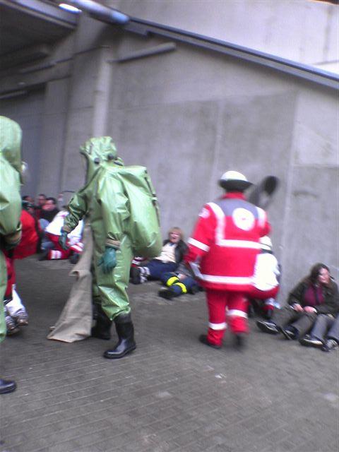 Ну и пиздец начинается. Оцепляют они нас обьявляют что там где мы сидим акурат заражение какой-то химической хуйнёй - яебу чем. Короче чего-то в этой бомбе там якобы было. Но слава богу химия а не биология. Ебал я эту занимательную биологию. Ну всё пиздец - в карантине. Теперь только через деконтаминацию наружу - нас уже не только эти уебни охраняют а уже и менты подтянулись. В карантине ебать сколько тысяч человек - а всем надо деконтаминацию пройти. Пиздец. Приехали. Домой я сегодня не попаду. Короче решил воспользоваться блатом. Посколку раненые были заняты поисками врачей, а врачи лечением раненых - им там не до химической хуйни было. Им там кишки по асфальту собирать надо было. Тоесть у всех были задачи поважнее - и мы под шумок пристроились к довольно короткой очиреди на деконтаминацию и всё прошло заебись. Хотя в температуру +2 голым под душ на улице лезть не особо в кайф - но делать нехуй либо так либо никак или в больничку. Через полтора часа короче я оттуда вышел. И тут мне достался первый и единственный ништяк: попал под раздачу жрачки. С таким опетитом я не жрал наверное никогда: хотя это были всего лишь макароны с мясом каким-то левым. Хуле - жив остался, организм радуется.