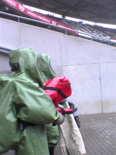 Продираемся обратно на трибуну. И тут, о чудо минут после 20 (!!!) - я замечаю шлем. Шлем немецких МЧСовцев это просто пиздец. Короче чуваки которые делали шлем по ходу были фанатами звёздных войн. Либо чуваки делавшие звёздные войны были фанатами немецких МЧСовцев - одно из двух. Подругому эту постанову я себе до сих пор обьяснить не могу - люка скайвокера все помнят тока из старых серий ещё? Вот кагда он на звёздной тарантайке летал шлем у него был такой с типо ирокезом посредине. Вощем шлемак как из Звёздных Войн - одно слово джедаи (Technisches Hilfswerk). Соизволили появиться блять. Хорошо ещё что трибуна верхняя не наебнулась - тогда-бы вообще пиздец был - хотя куда уже дальше лично мне представить сложно. Снаружи слышно что потихоньку пожарные начинают подьезжать - они тоже типо джедаев, только каски у них больше фашисцкие напоминают. Ну уже вроде не так стрёмно как в начале. И медиков уже вроде в общей массе иногда видно. Вся трибуна это один сплошной муравейник - там постоянно произходит хаотичное движение. Воздуже непрекращающиеся крики - люди бегают туда-суда на выходе где мы оставляем траспортабельных раненых уже едёт во всю сортировка: раненых надо сначала отсортировать на лёгких и тяжёлых. Тяжёлым помощь оказывается понятное дело раньше. Но проблема в том что большинство тяжёлых ещё в стадионе на трибуне лежат и кишками в асфальте ковыряют. Тоесть если тебе руку оторвало привели тебя на выход, и сиди полчаса жди - рукой своей оторванной можешь помахать если припёрло - никто к тебе не подойдёт. Ну тут уже всяких спасателей понаехало ёбаная туча - я уже понял что мне тут уже потихоньку делать становиццо нехуй- без меня разберуццо уже. Воспользовался моментом и сел у выхода покурить. Блять час прошёл но за этот ебаный час я больше увидел чем за два предыдущих года. Нуевонах короче.
