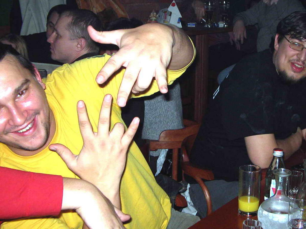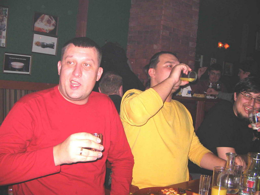 Началось всё вполне пристойно, за полчаса до срока Удав с группой близко живущих камрадов заняли первые столики, сдвинули их в один и культурно заказали «по Гиннесу». Должен заметить, что хитрый Удав вновь продемонстрировал себя абстинентом. Постепенно, в течение часа-двух, толпа благополучно заполнила снятый зал, столы стали сдвигаться во всё более длинную колбасу, а действие плавно перешло из стадии «слово за слово» в стадию «хуем по столу».