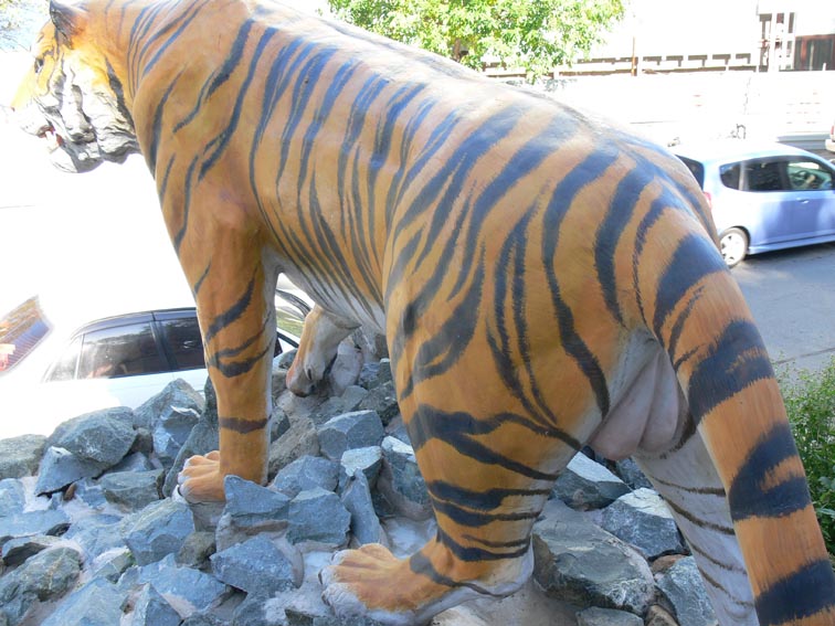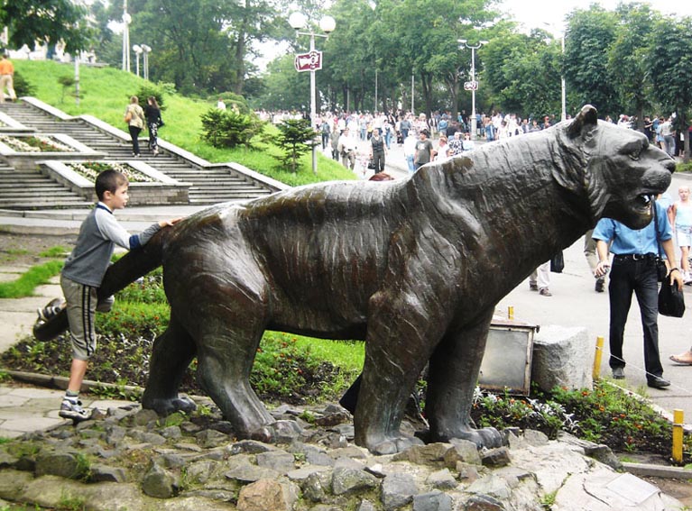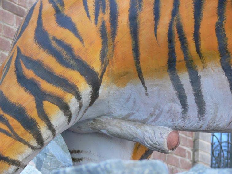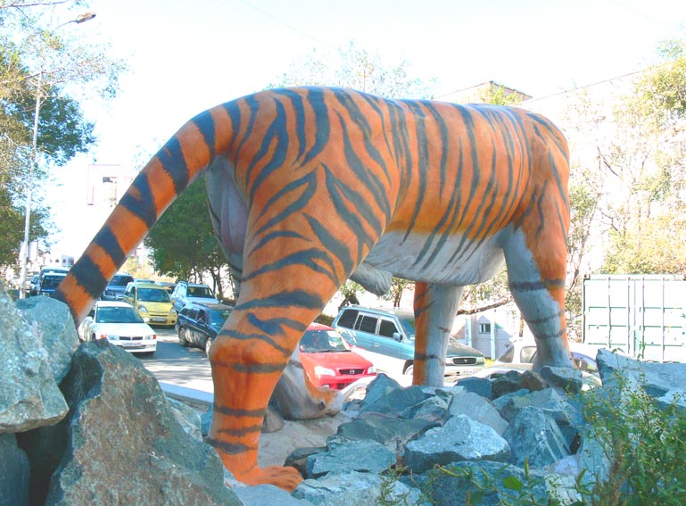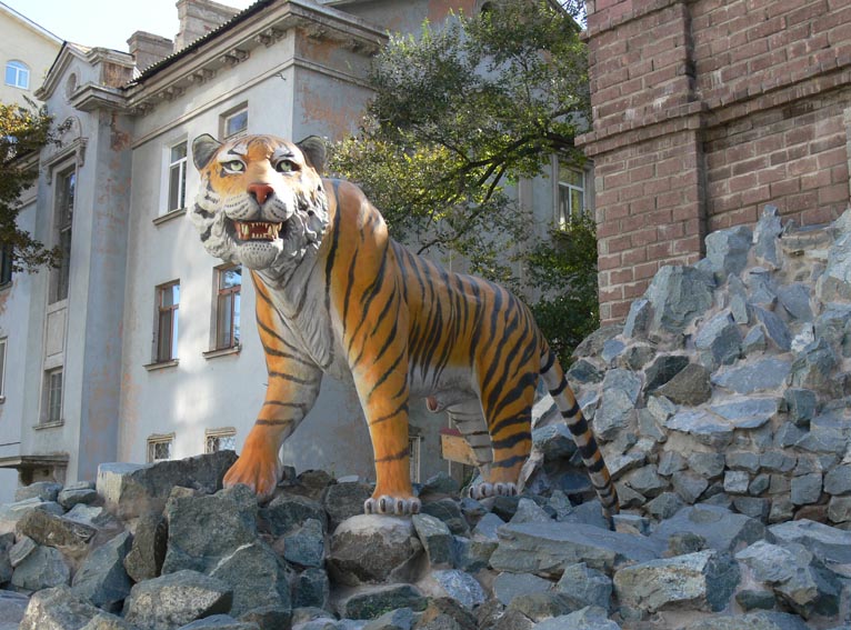 У кинотеатра «Океан», метрах в ста, к морю, там тигр консервативный, без причиндалов. К нему мамы детишек водят фотографироваться. А к этому – нет. И правильно! Нечего детей пугать, ссаться будут. Свирепое выражение лица у цветной тигры, «для взрослых».
