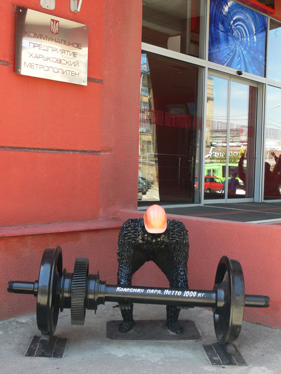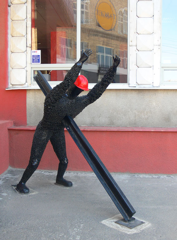 15-16 Возле управления метрополитена чудят. Раньше «штангист» стоял, теперь чела с рельсой добавили. Странные фантазии.