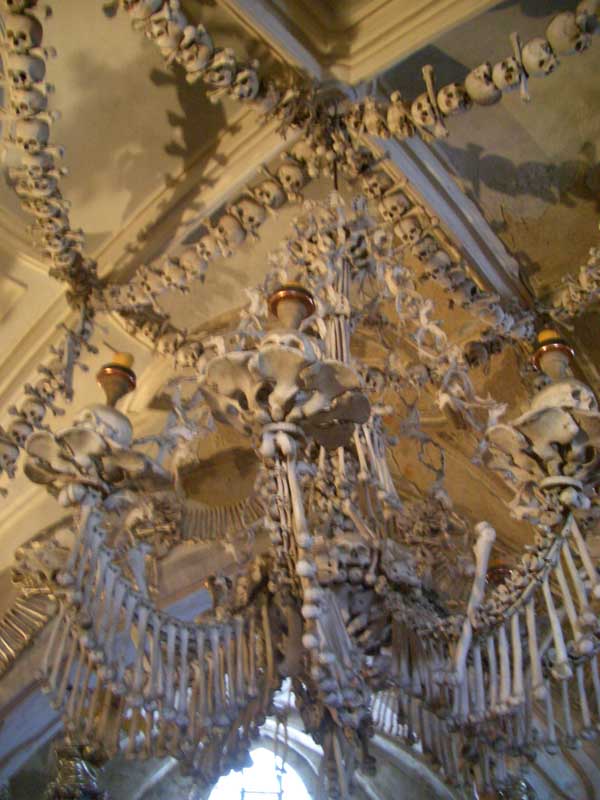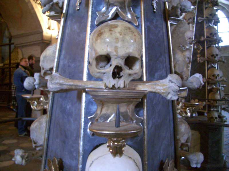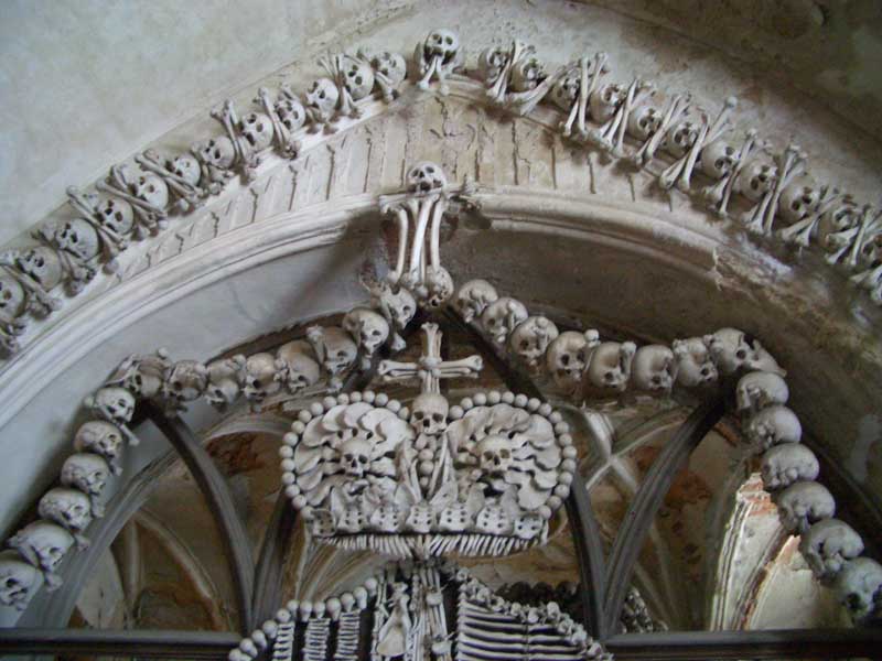 Это на кладбище в Кутной Горе часовня такая (то ли "часовня-костяница", то ли "часовня Костяницы")... Собирать эти поделки начал слепой монах, и начал он с пирамид из черепов. Типа хотели сначала просто кладбище и часовню заложить на этом месте, а когда начали копать, то нашли кучу костей неизвестных людей, и чтоб не выкидывать, один слепой монах стал складывать из черепов пирамиды, а потом другие впряглись и начали мутить другие поделки - люстры, подсвечники, гербы... В гербе, типа, использованы абсолютно все кости человеческого скелета (от черепа и до костей мизинцев как рук, так и ног)...