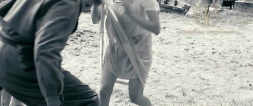 Да, в фильме еще присутствует любовная линия, куда ж без нее. Некий немецкий акупант решил поинтересоваться у встреченной им девушки Маши, носит ли она трусы, но был послан нахуй и отпизжен. Не найдя взаимопанимания, Машу он застрелил, и сам съебал на матацыкле с такими же акупантами. Наверна фотографироваться.