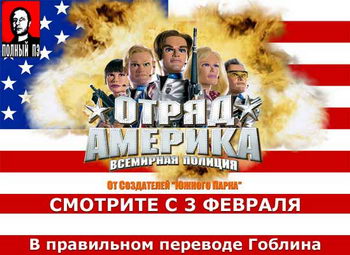 Я чессна говоря прихуел, када увидел афишу, шо в кинатиатре буит идти фильм в Гоблиновском ПРАВЕЛЬНАМ пириводе, фильм пат названием «Отряд Америка /Всемирная палицыя”. Единственная приписка: «Тока для взрослых». Гоблина как переводчика я немнога уважаю, но тока за правелные переводы. Бывает в его творчестве и хуйня. Но сейчас не о хуйне а о «Команде Америка». В этом хвильме а вернее сказать полу-мульте (весь пипл – куклы – марианетки, каторыми управляют натруженные грабли куклаводав, дергая за нити как в дрочерной агонии), пиндосы абсерают сами себя, т.е. смеюцца над сабой же. И над «непабедимастью пиндостана» и над «мирам ва всем мири». Причом с ахуенной долей самоиронии. Кроме этава картина изобилует пашляцкими шутками – ахтунгового содержания. Наверно америкосы думают, шо весь мир буит усыкацца над их изысканными изъёбствами. Наивные. Хатя Гоблин атжок с переводам зачотна.
