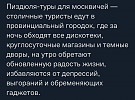«У меня на работе бухгалтерша есть. Шариком зовут. Вернее, я вообще ниибу как её зовут. Шарик и Шарик. Ты в боулинг играла? Шары там видела? Вот вылитая наша бухгалтерша: круглая, лысая, и три дырищи на ебальнике: глаза и рот. Она вчера из отпуска вернулась – мы всей конторой охуели: волосищи до пояса!»