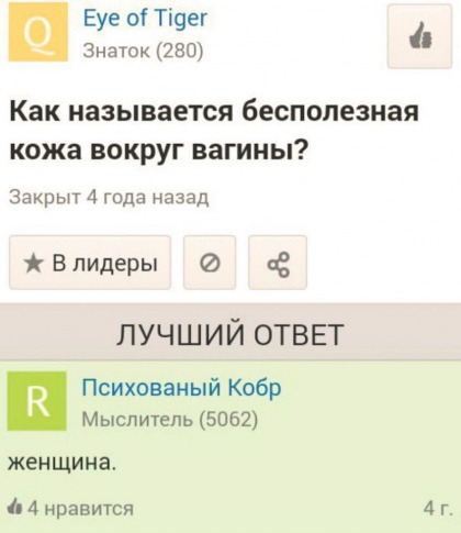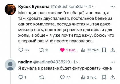 «То есть кормить, одевать, ебать и выгуливать. Мыть не надо, моются они сами... - интендант секунд на десять замолчал, отхлебнув виски, - оказалось это не так. Женщины очень странные существа. К примеру, крокодил наверняка считает себя венцом творения. А какую-нибудь «Мисс Вселенная» - либо пищей, либо  невнятной хуетой. И какое мнение крокодила для женщины обиднее, не ясно.»