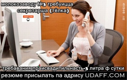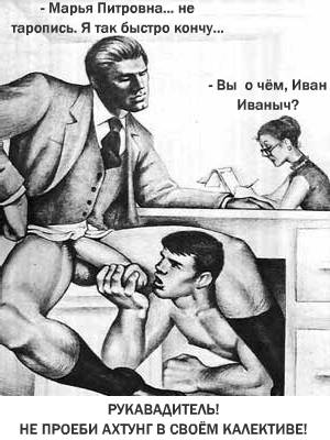 «Подхожу к ней на цыпочках сзади и машу бибислом над плечом. Сюрприз хочу сделать. Она не видит, пиздит своё: «Почему молчите? - спрашивает у компа,  - Мне обратная связь нужна! Ставьте плюсики, если всё понятно объясняю!» Ну, не дура, бля? «Ща тебе всё объясню!» - думаю. Беру, через её плечо изловчился так, и, хуяк, тыцнул залупой под челюсть, что у девахи аж зубы клацнули. Не теряя инициативы, отвожу хуй в сторону и шлёп по губищам! »