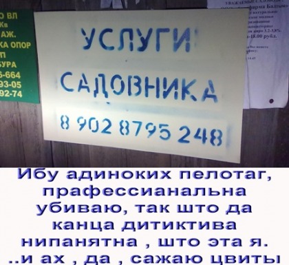 «А где, спрашивает Танька, чо нить от инспектора налогового вашего? Какой нить хотя б волос или ноготь состриженный. Нет, отвечает он, ни хрена. Тока вот подпись этого мудака на акте проверки. Ладно, грит она, пойдет вполне. Ща мы эту подпись так закрутим, что у него руки поскрючивает. И по всем прогнозам через пару лет он даже подрочить не сможет. Отсохнут к хуям. С охранником, скотиной этой неблагодарной, тож проблем не возникнет. Я заклятие наложу и у него случится отвращение ко всякой ебле с бабами. Станет редкостным пидаром.»
